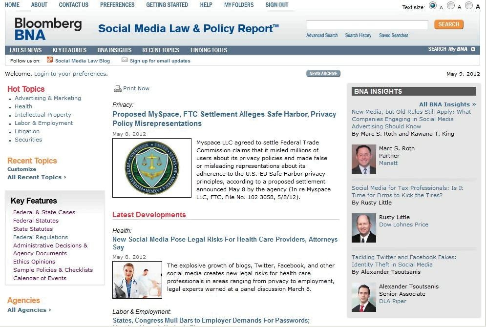 BNA describes the product as a hybrid between the traditional BNA electronic newsletters and the BNA practice centers. Unlike most BNA services, this product will not have a print counterpart and will not be updated on a formal daily or weekly publishing schedule. SMLPR will be a web-only product which is continuously updated. Subscribers can also set up personalized alerts and receive email delivery of all news or custom news updates as they are posted. While some of the materials will appear in other topical reports, the materials selected for inclusion in the SMLPR will all focus on some aspect of social media law.