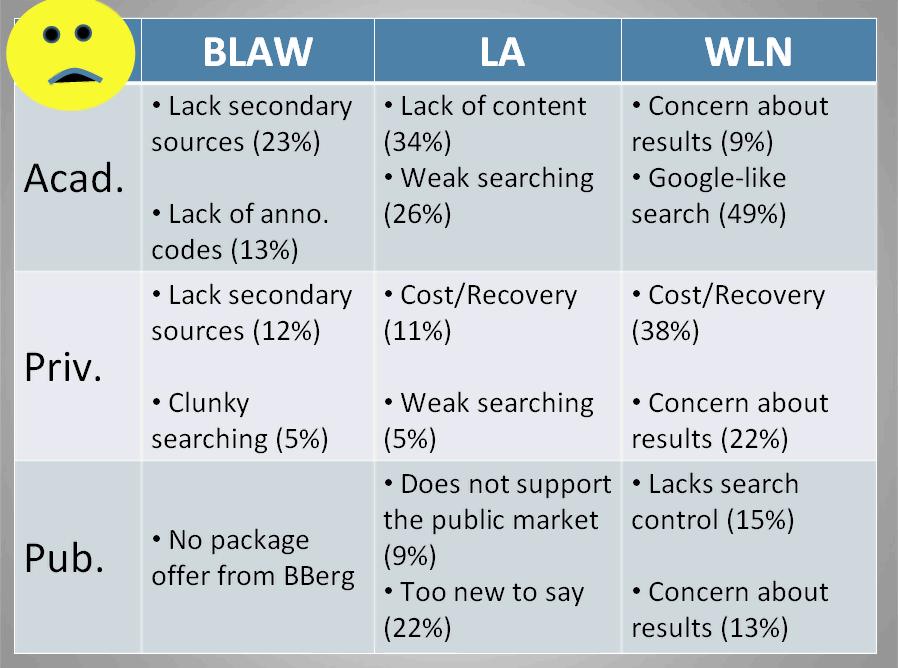 The chart below shows the two most negative aspects of each services noted in private firm, law school or government libraries.