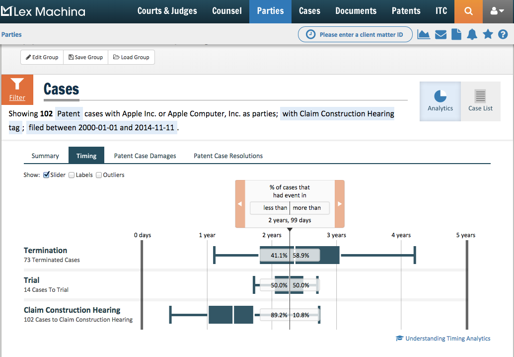 Custom Insights for Timing (Analyze Time to Termination, Claim Construction, Hearing, and Trial, to determine how long it